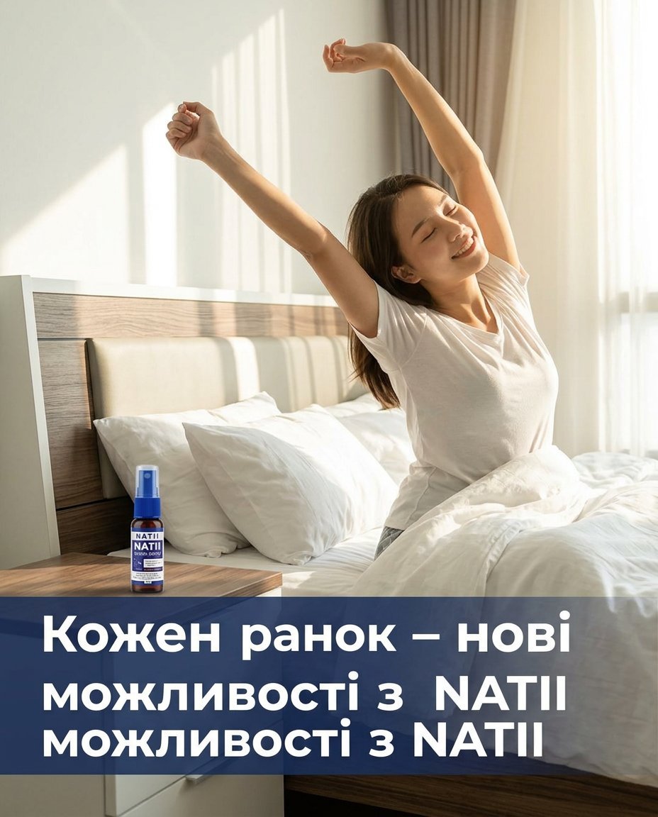 З NATII ви забудете про поверхневий сон та часті пробудження. Наш спрей забезпечує глибокий і безперервний сон, дозволяючи вашому тілу повністю відновитися. Він заспокоює розум і нервову систему, зменшуючи стрес та напругу після напруженого дня. NATII безпечний, не викликає звикання та не містить агресивних хімікатів. Не пропустіть шанс змінити свої ночі назавжди, адже ця акція діє обмежений час.